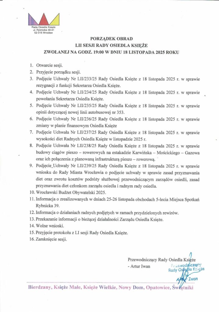 Informujemy Państwa o terminie LII sesji Rady Osiedla Księże — dn. 18.11.2025 r., godz. 19:00.